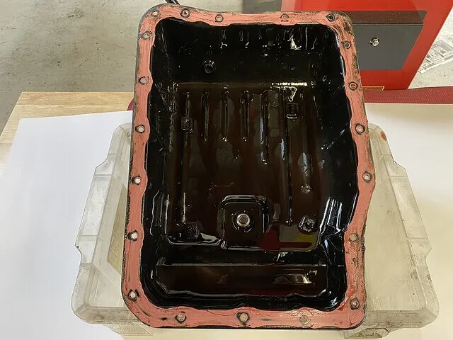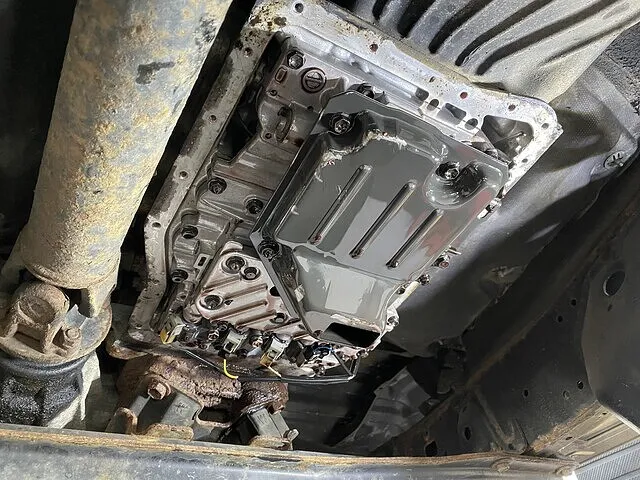 AT/CVTのオイルパンを取り外し、底に溜まった鉄粉、汚れをを取り除きます。