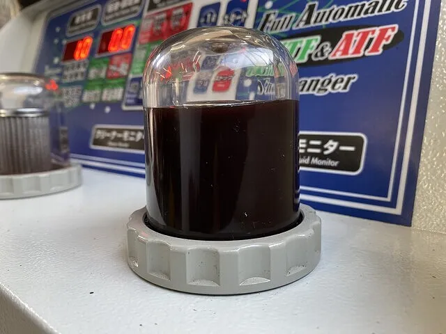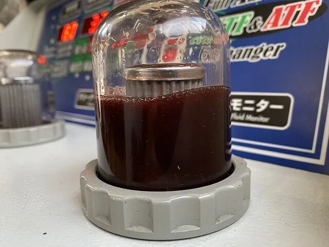 はじめにコンタミチェックを行い、オイル内にどれ位汚れがあるか確認いたします。