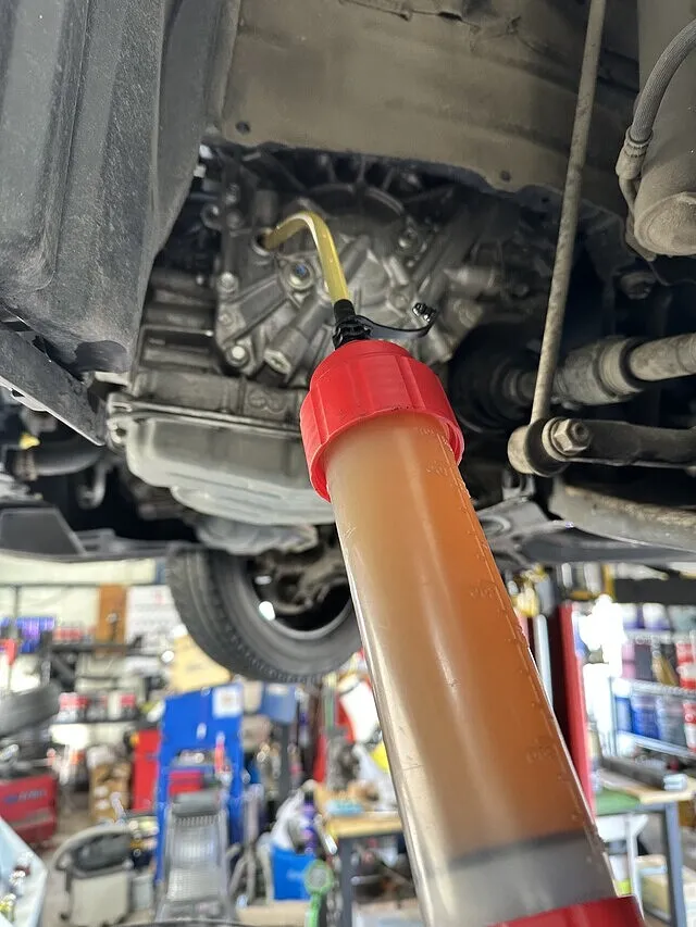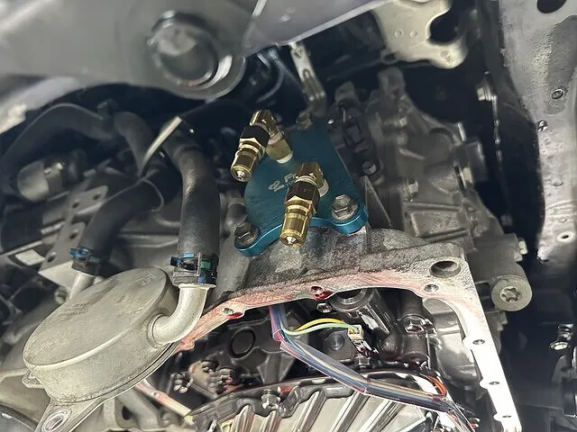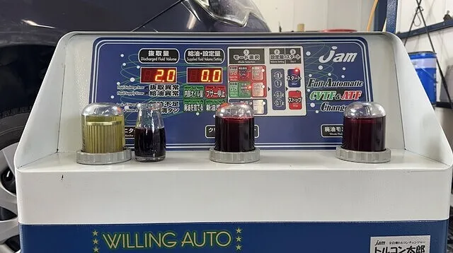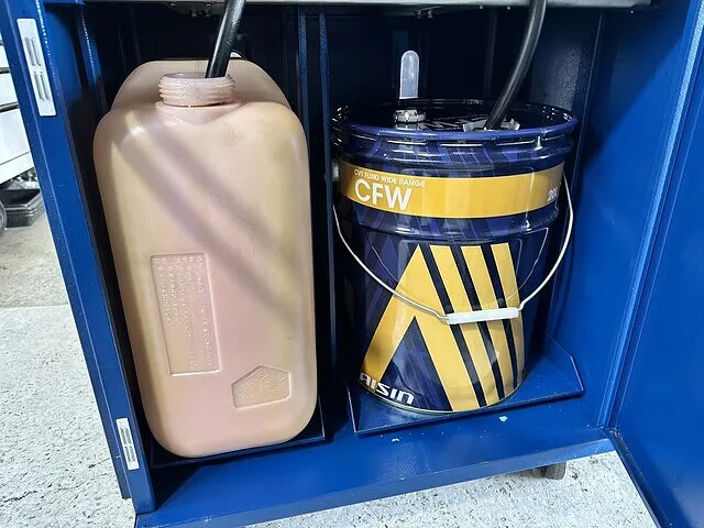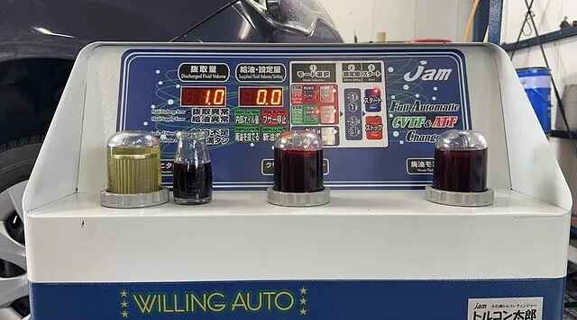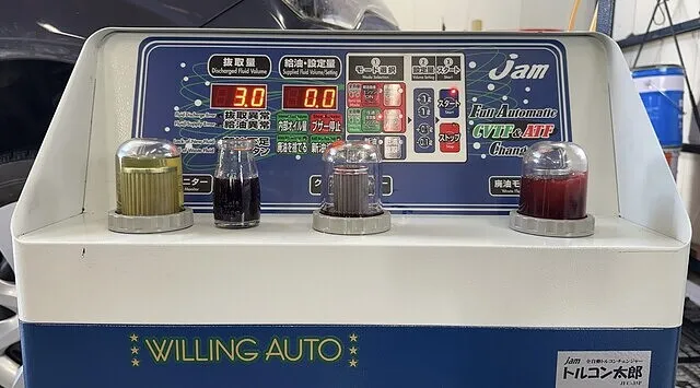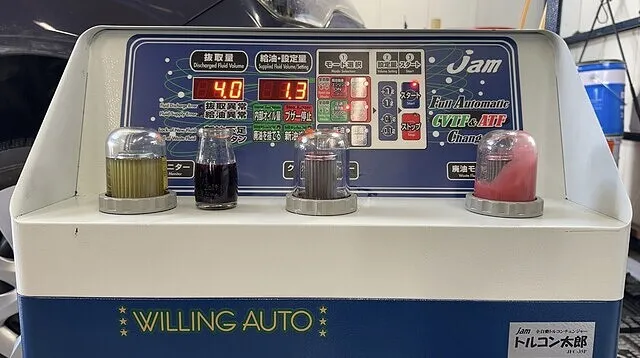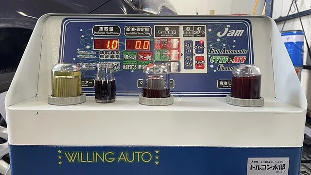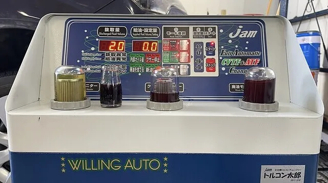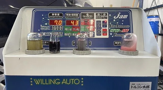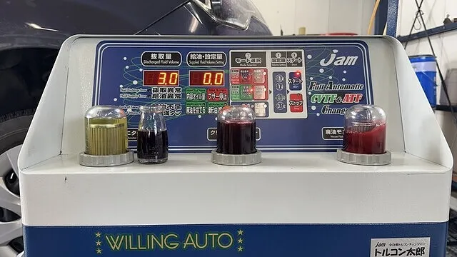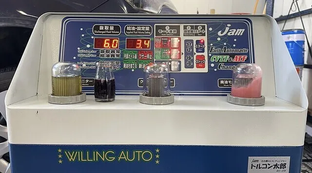 アイシンCFWをセットしオイルパン脱着時に抜けた分を充填し1回目の圧送交換開始いたします。