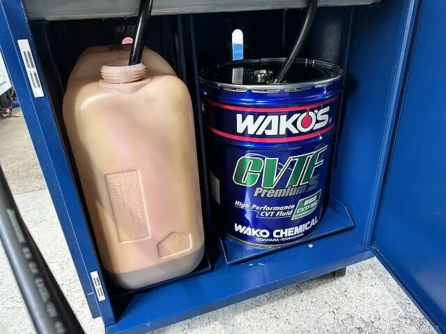 ワコーズCVTFプレミアムスペックをセットし2回目の圧送交換開始です。