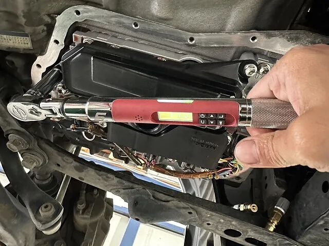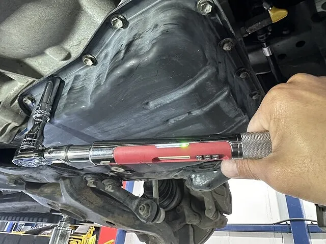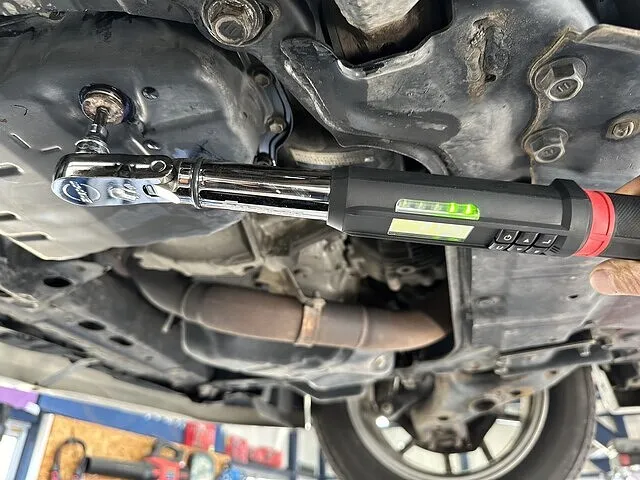 スナップオンデジタルトルクレンチを使用し、ストレーナー、オイルパンを取り付けます。