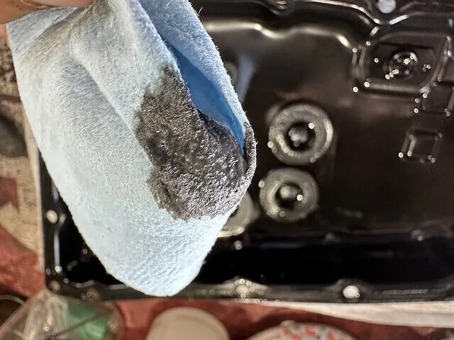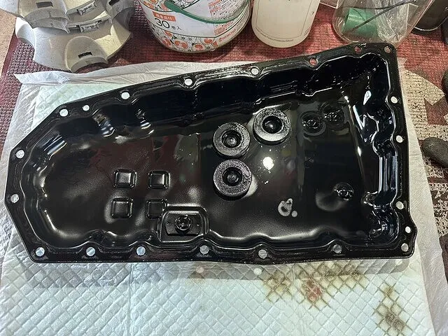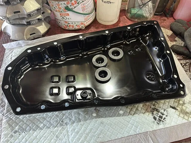 オイルパンも汚れておりますので洗浄剤を使いきれいにしていきます。
